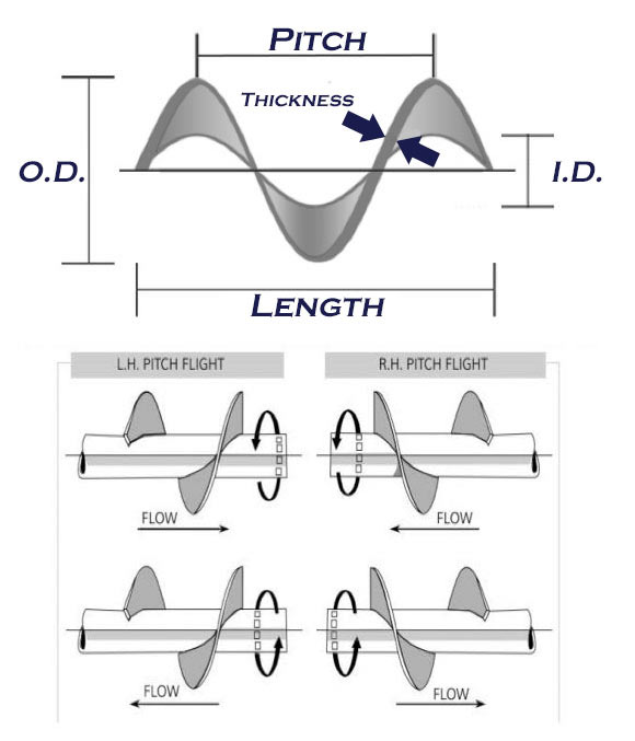 Sectional and Edge-wound flighting in carbon steels, abrasion-resistant and stainless steels.