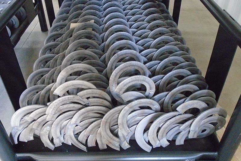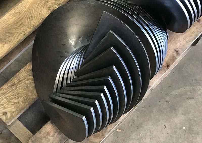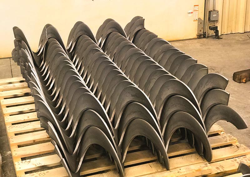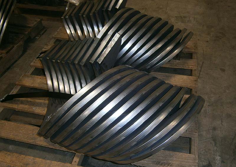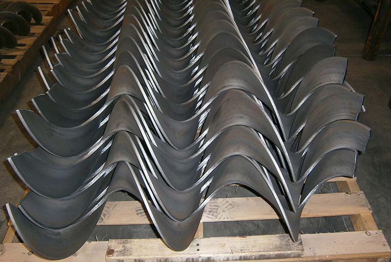 We manufacture sectional flighting by cutting blanks from plate metal and forming into individual one-pitch segments with precise outer diameter, inner diameter and pitch dimensions. We produce flighting in thicknesses ranging from 3/16" to 1" with the flight thickness maintained constant from inner to outer edge. Outer diameters range from 5" up to 72".